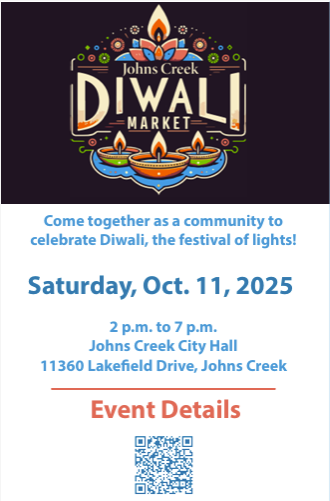 The City of Johns Creek’s Diwali Market will take place on Saturday, October 11, from 2:00 p.m. to 7:00 p.m. Held at the Johns Creek City Hall, this exciting and free event will feature a market of food and retail vendors along with live entertainment. You’ll get to taste traditional foods associated with this rich festival. This market is a community-organized Diwali event to embrace and celebrate the cultural diversity of our community. Even if you don’t celebrate Diwali, this event is a great opportunity to learn about a new culture and experience the beauty of Diwali! So, bring your family, friends and loved ones out to the Diwali Market to experience the vibrancy and significance of Diwali.