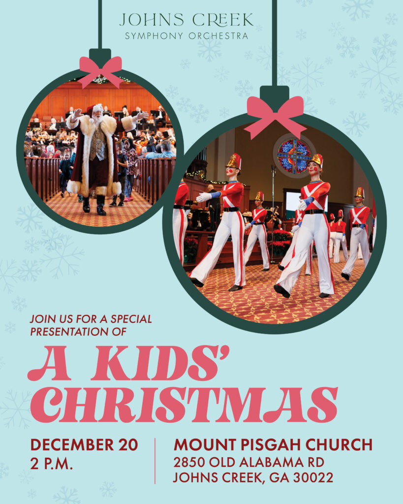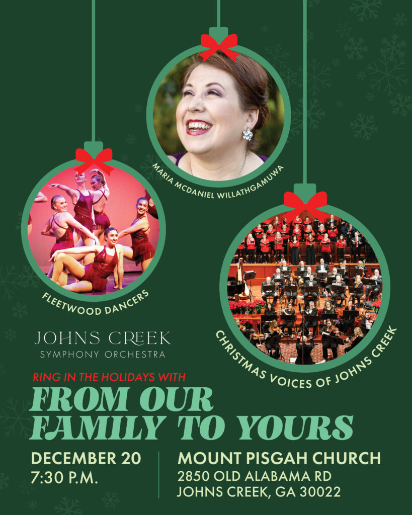 Whether you’re sticking around after the Kid’s Christmas Concert or you just love to listen to the classics, Johns Creek’s Symphony Orchestra has you covered this Christmas! Join us and feel like family on Saturday, December 20th at 7:30 PM at Mount Pisgah Church for our heartwarming holiday concert, From Our Family to Yours, where you can experience expressive arrangements of all of your favorite Christmas classics. ‘Tis the season for good music, good times, and fun for the whole family! Students age 21 and under attend free – must secure tickets online!